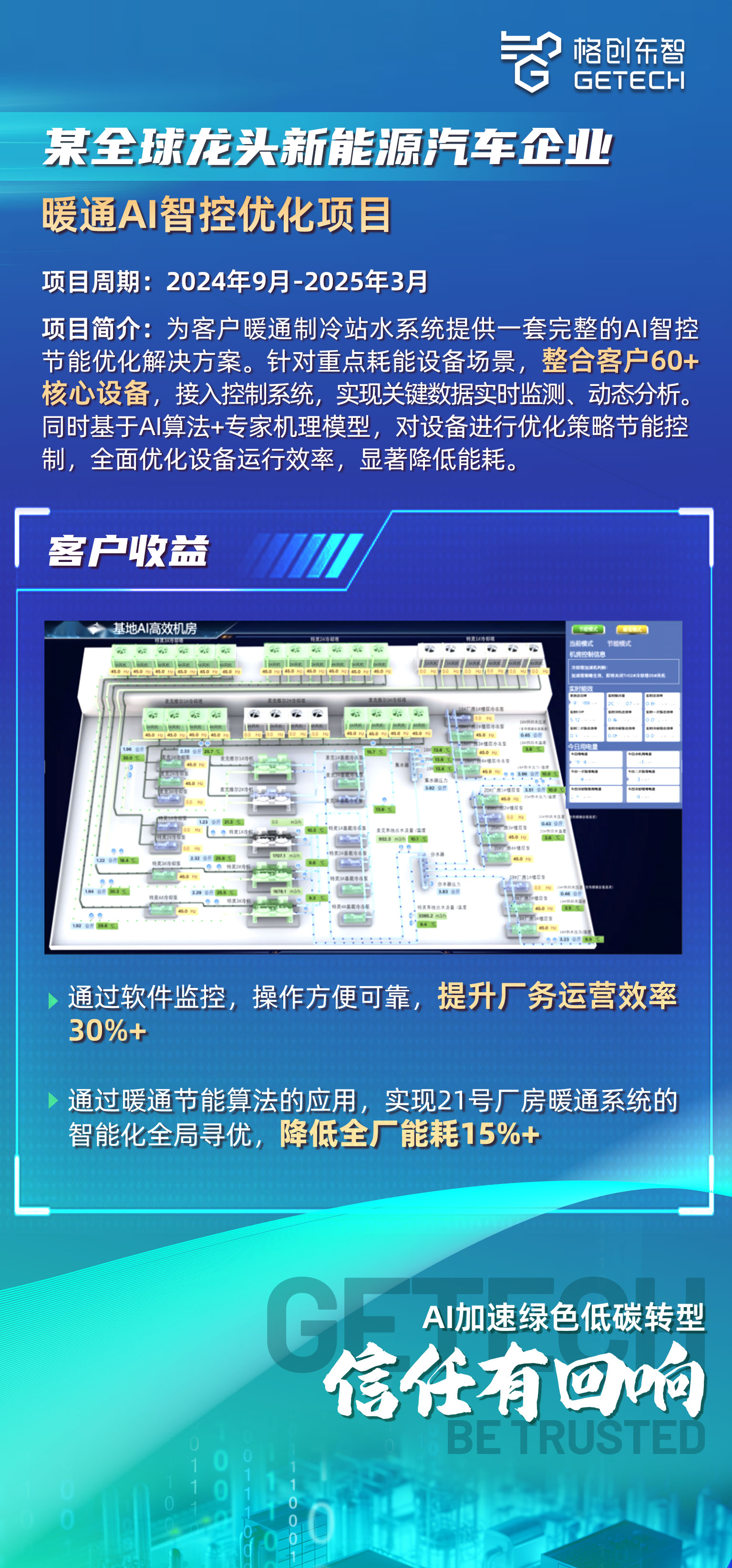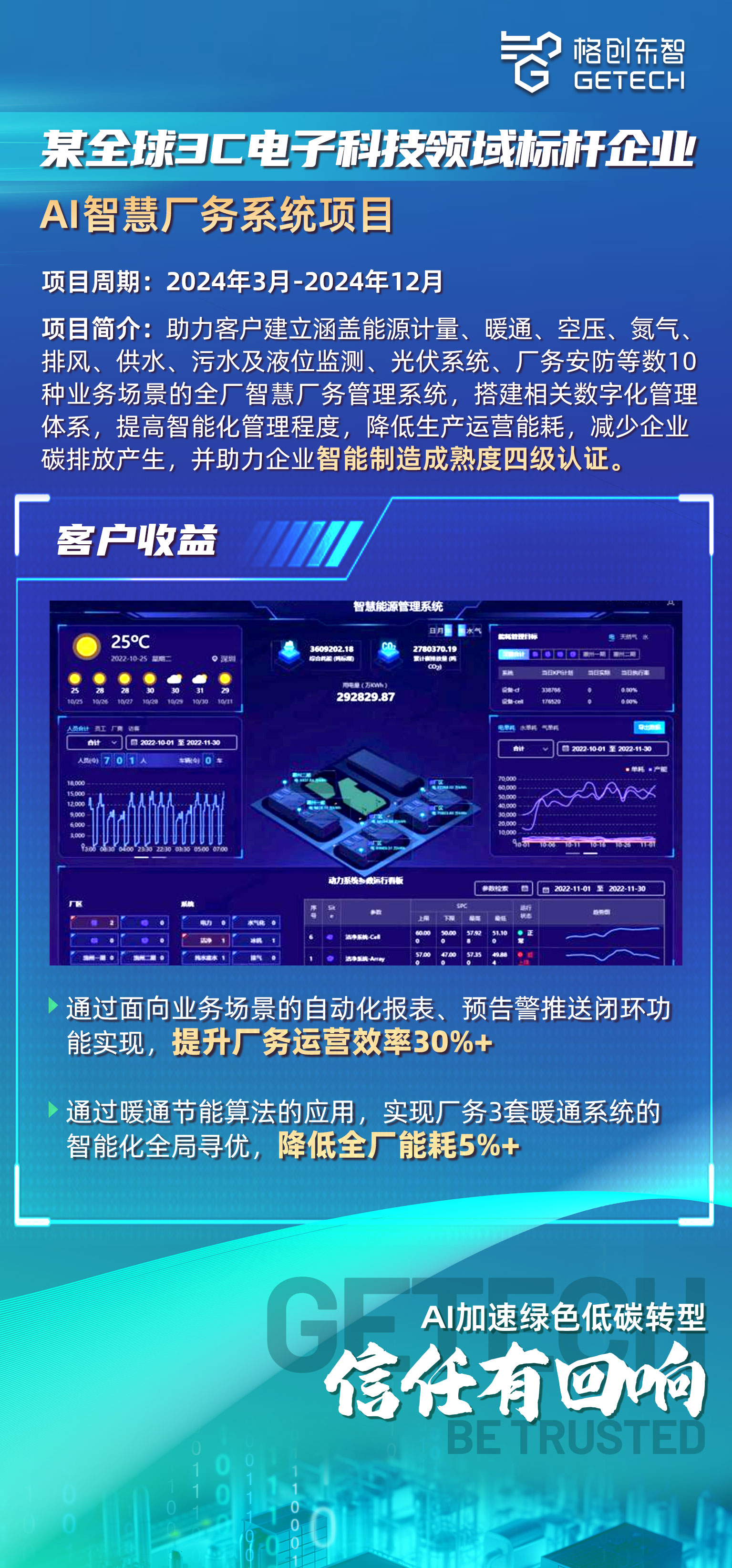 Paving the way for green development and empowering manufacturing. GETECH empowers the coordinated development of industrial green and low-carbon transformation and smart facility management with AI technology. By integrating the Energy and Carbon Brain Platform with large AI models and offering professional, comprehensive ESG consulting services, it enables manufacturing plants to achieve four key values: energy saving, cost reduction, efficiency improvement, and sustainable development, helping China's advanced manufacturing industry remain invincible amid the global dual-carbon transformation wave.
