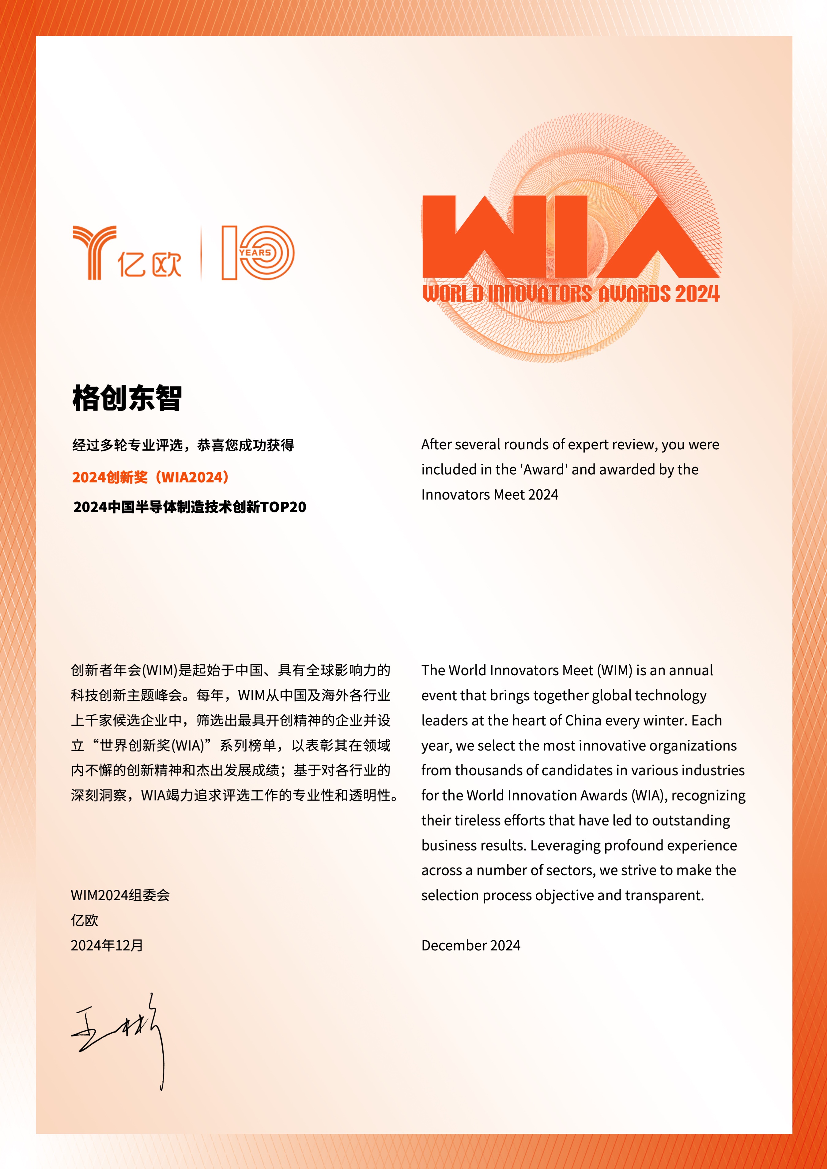 又拿奖了,亚星游戏官网东智荣登亿欧WIM“2024中国半导体制造技术创新Top20”
