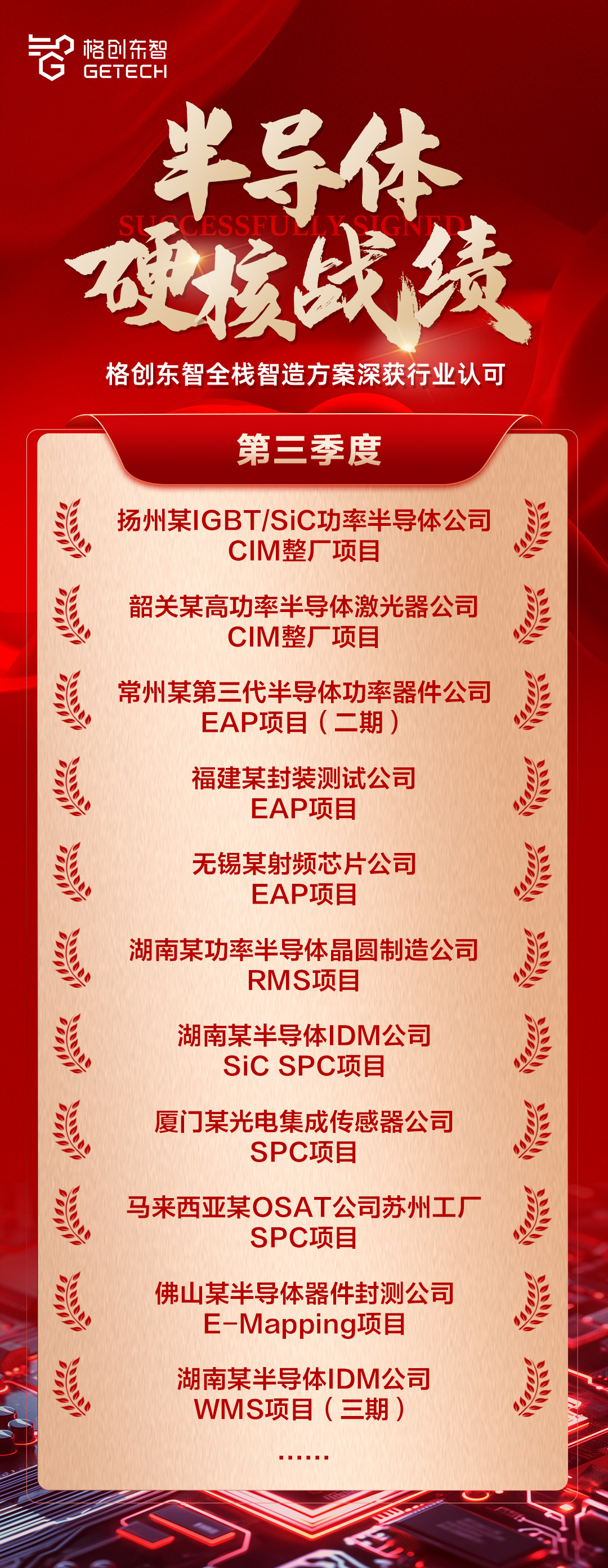 EAP(设备自动化系统):接连拿下常州某第三代半导体功率器件公司、福建某封测公司、无锡某射频芯片公司项目。凭借稳定高效的设备连接与数据采集技术,为不同技术路线的芯片制造筑牢自动化基石,实现设备数据的实时监控与精准分析;
