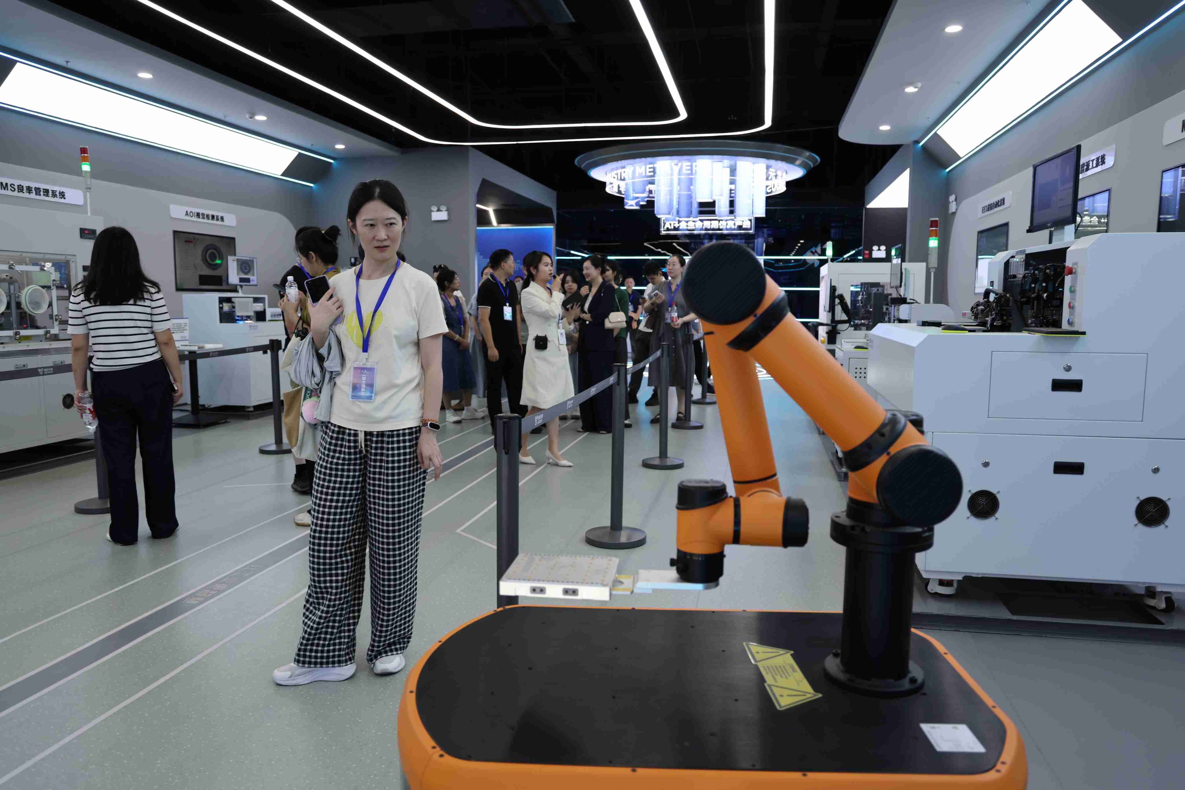观察团成员在亚星游戏官网东智工业智能创新基地(武汉)体验智能设备。记者彭年 摄