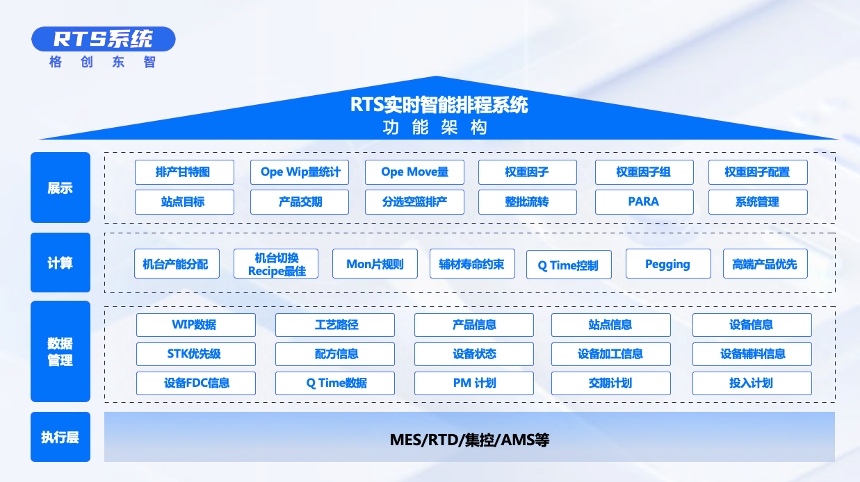 数据层:深度集成MES、FDC、PM等系统,实时采集设备状态、WIP位置、工艺参数、Q Time时效等核心数据,构建毫秒级更新的产线数字孪生模型。