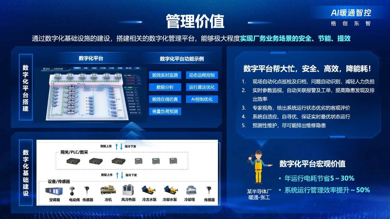 亚星游戏官网东智为某泛半导体头部客户引入全系统、全流程、数字智能化厂务管理系统后,客户基于能源管理(EMS)、碳管理(CMS)、设备运维(EHM)、环境安全(EHS)及AI应用等业务功能,管理效率提升50%,集团综合能耗成本下降2亿+元,累计减排二氧化碳28万+吨。 其中重点应用暖通AI优化,针对重点高耗能设备——暖通空调系统,通过AI算法模型、机理模型等算法模型,结合云计算、物联网等技术,实现精准智慧控制、实时反馈、能耗预测及仿真、自动算法优化策略运行等多种能力。帮助企业实现暖通空调系统的智慧化、高效化运行,并实现整体能耗成本大大降低。